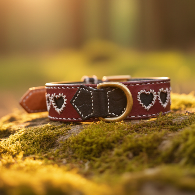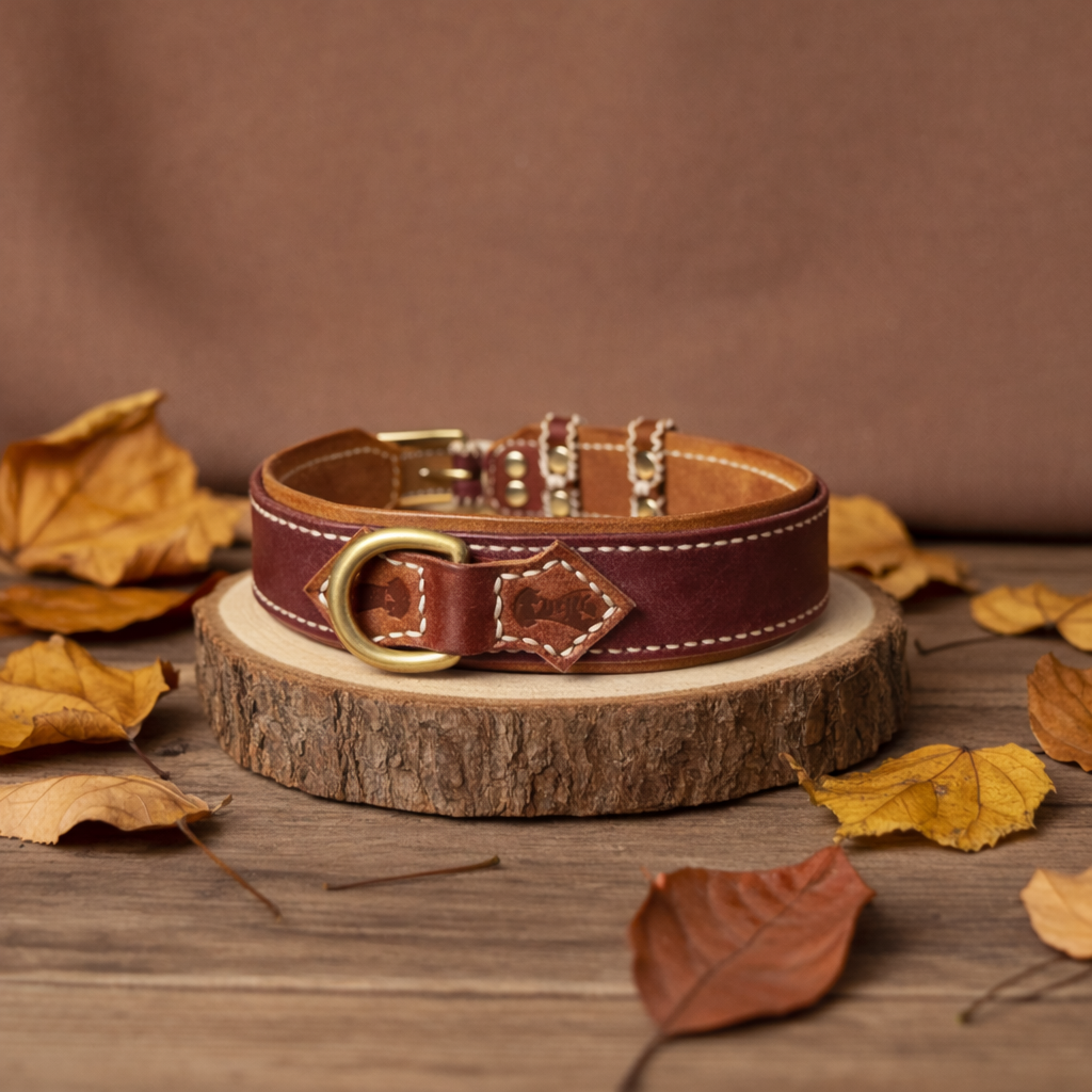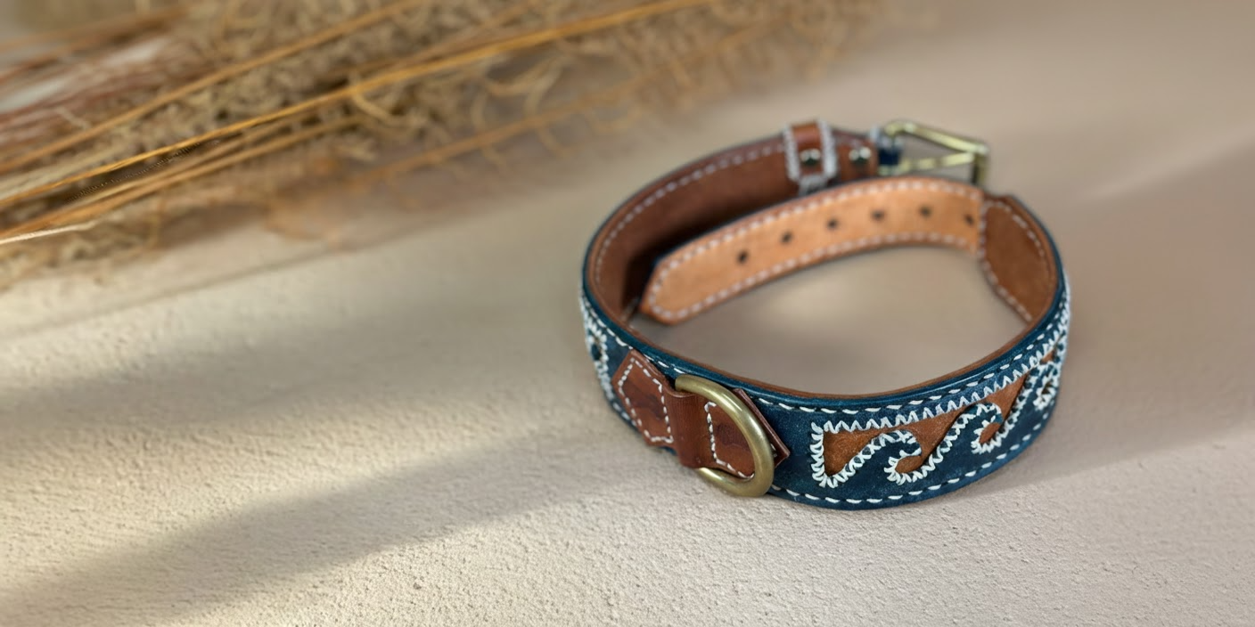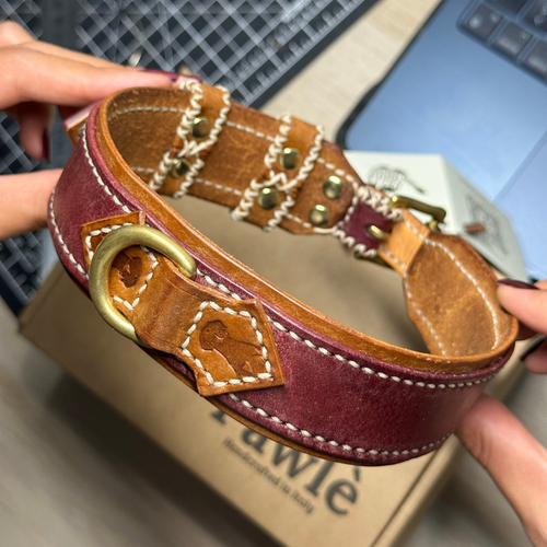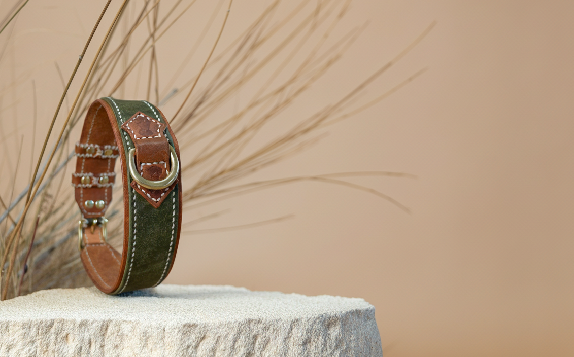 Lavoriamo ogni collare interamente a mano, utilizzando pelle vera conciata al vegetale e hardware in ottone massiccio.